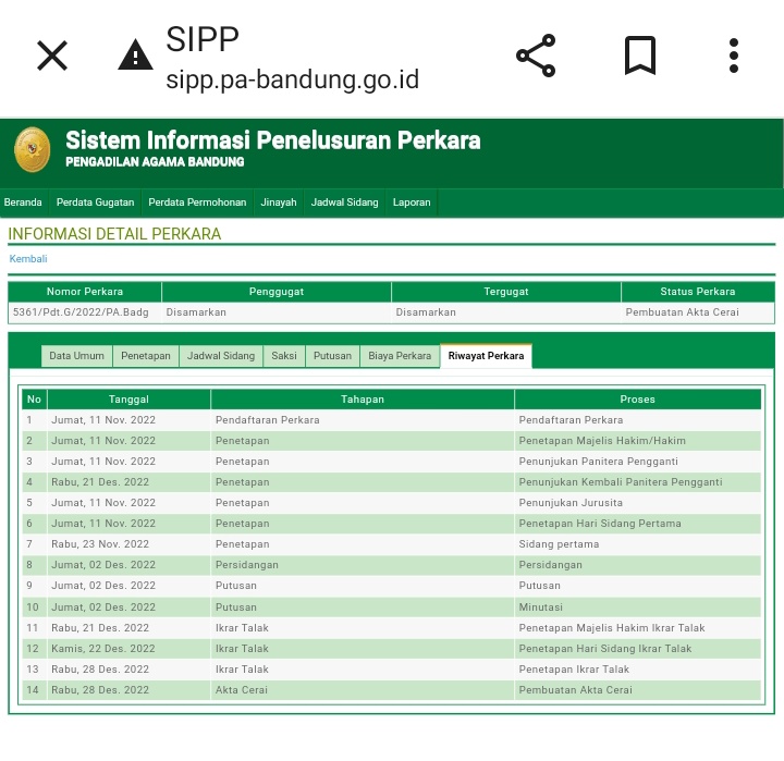 Ditelusuri dari laman resmi Pengadilan Agama Bandung, nomor perkara tersebut telah diputus pada 2 Desember 2022 dan Ikrar talak telah dijatuhkan pada 21 Desember 2022. Akta cerainya sendiri telah diterbitkan pada 28 Desember 2022.