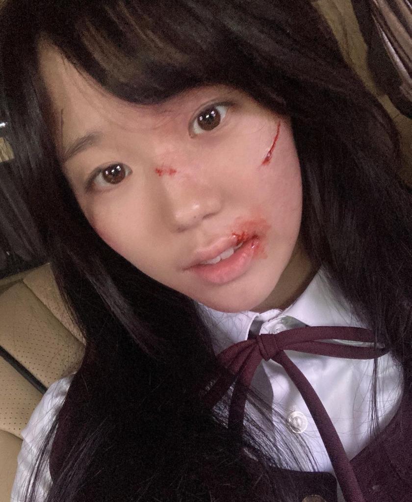 Di foto berikutnya, Lee So E yang sama sekali berbeda muncul dengan wajah berlumuran darah saat dia berperan sebagai korban kekerasan di sekolah.