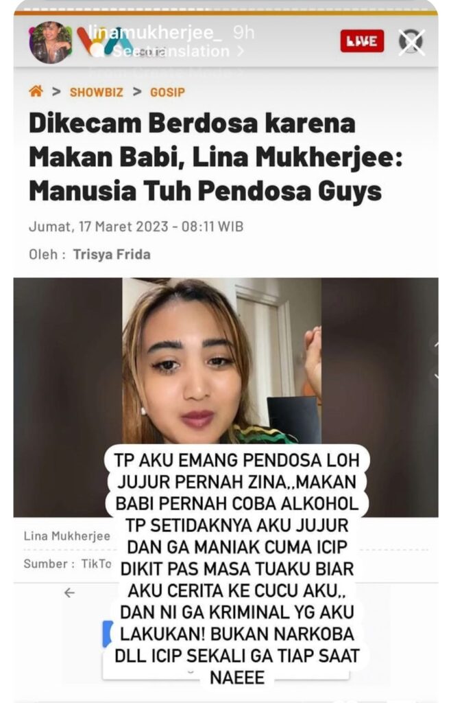 "Sekarang gini ya, gue muslim gue makan babi gue dosa. Lu muslim pernah berzina nggak? Dosa yang lain? Apakah kamu suci 100 persen? Bisa aja kamu nipu orang, bisa aja kamu durhaka, bisa aja kamu pelit. Banyak lah, manusia itu pendosa guys," kata Lina Mukherjee dalam live TikToknya, Senin (13/3/2023).