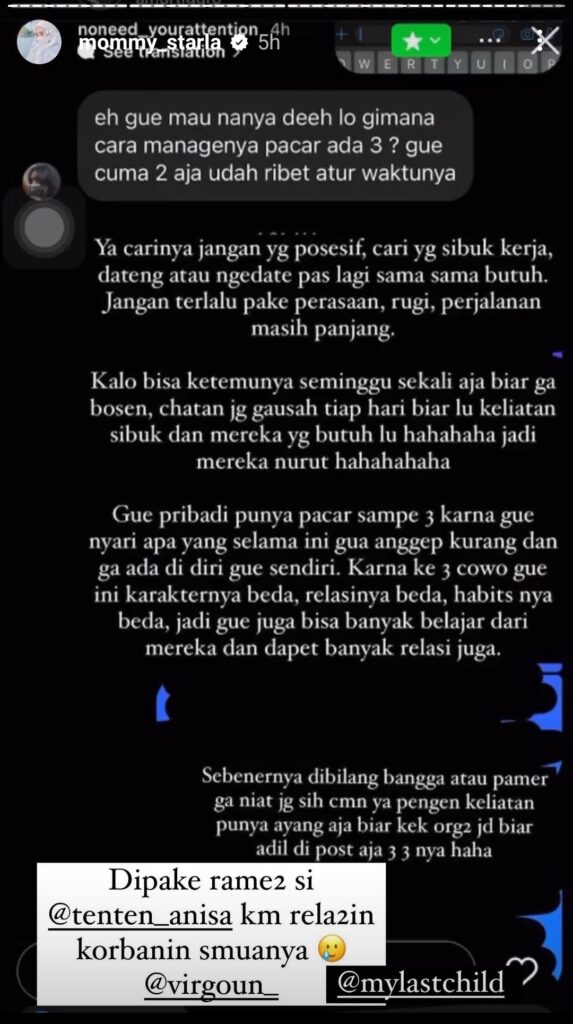 Inara juga menyoroti tindak-tanduk Tenten Anisa. Dalam unggahannya, Inara membeberkan kalau Tenten tidak hanya bersama Virgoun, tapi juga memacari pria lain. Bahkan Tenten mengajari perempuan lain, gimana caranya bisa pacaran sama 2-3 pria sekaligus.