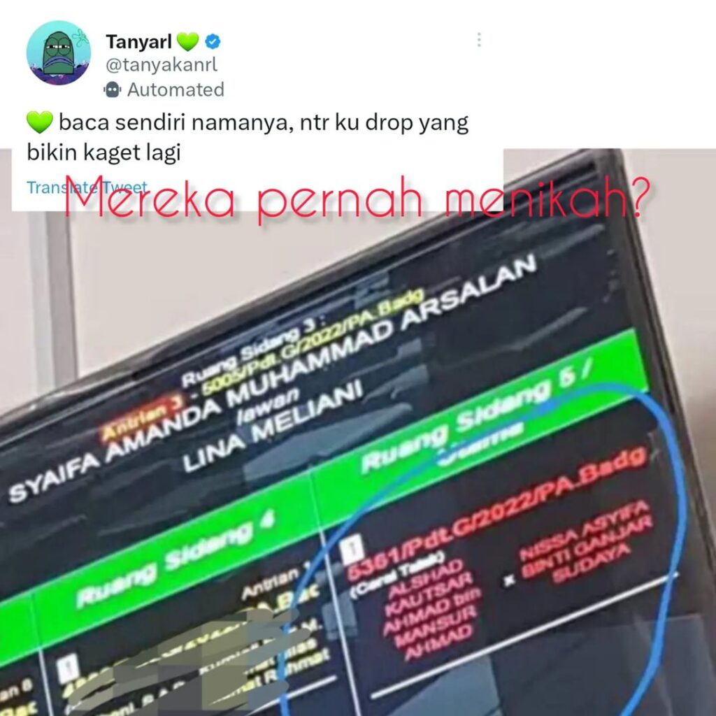 Tak lama berselang, sebuah akun Twitter @tanyakanrl mengunggah foto situs pengadilan agama, Bandung. Dimana, di sana tertera nama Alshad Kautsar Ahmad bin Mansur Ahmad serta Nissa Asyifa binti Ganjar Sudaya.