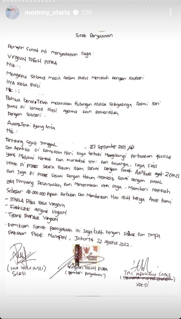 Atas semua fakta dan bukti yang dikeluarkan sang istri, Virgoun mengakui semua perbuatannya. Ia menuliskan surat pernyataan, bahwa telah melakukan semua perbuatan asusila tersebut.