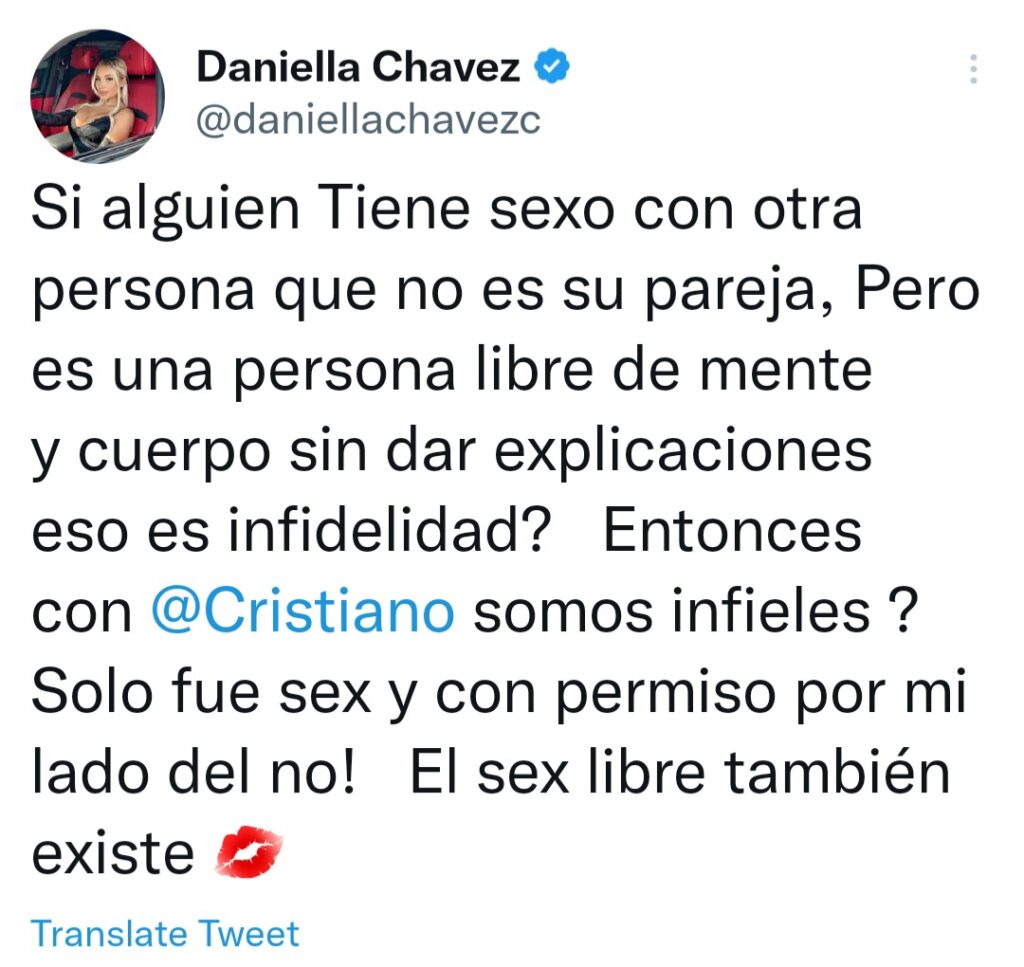 "Jika seseorang berhubungan seks dengan seseorang yang bukan pasangan Anda, tetapi sama-sama individu yang berpikiran bebas, apakah itu dianggap selingkuh? Jika demikian, apakah Cristiano dan saya tidak setia? Itu hanya seks. Seks bebas juga ada. Sebelumnya, saya menyembunyikannya," twit Daniella Chavez sebelum dihapus.