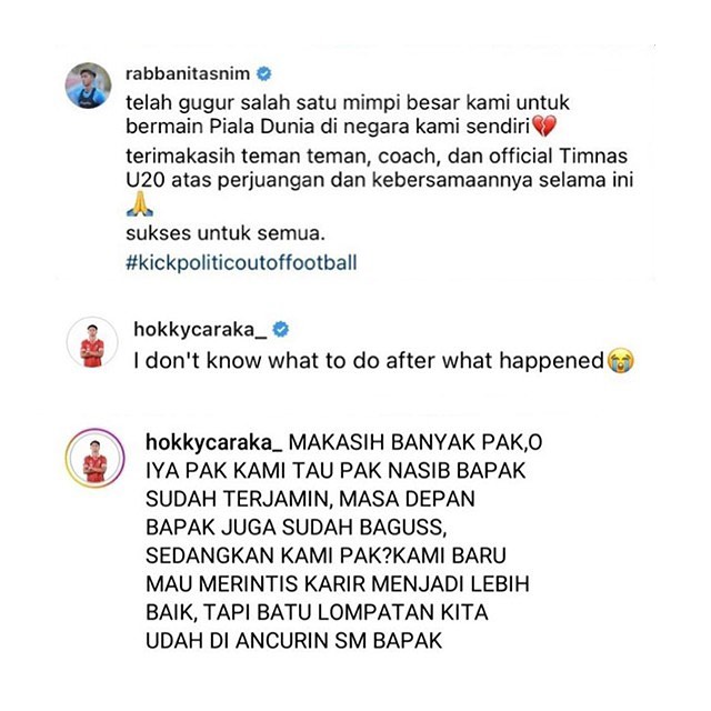 "Terimakasih pak, kami tau pak bahwa bapak mempunyai nasib yang bagus dan terjamin, berbeda dengan kami, kami baru merintis karir untuk menjadi lebih baik, tapi kesempatan emas itu malah dihancurkan," tulis @hokkycakara selaku salah satu punggawa Timnas.